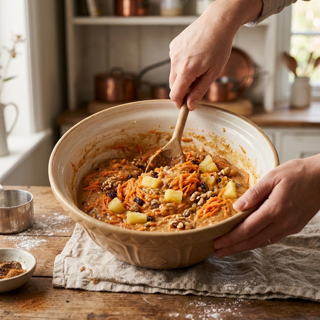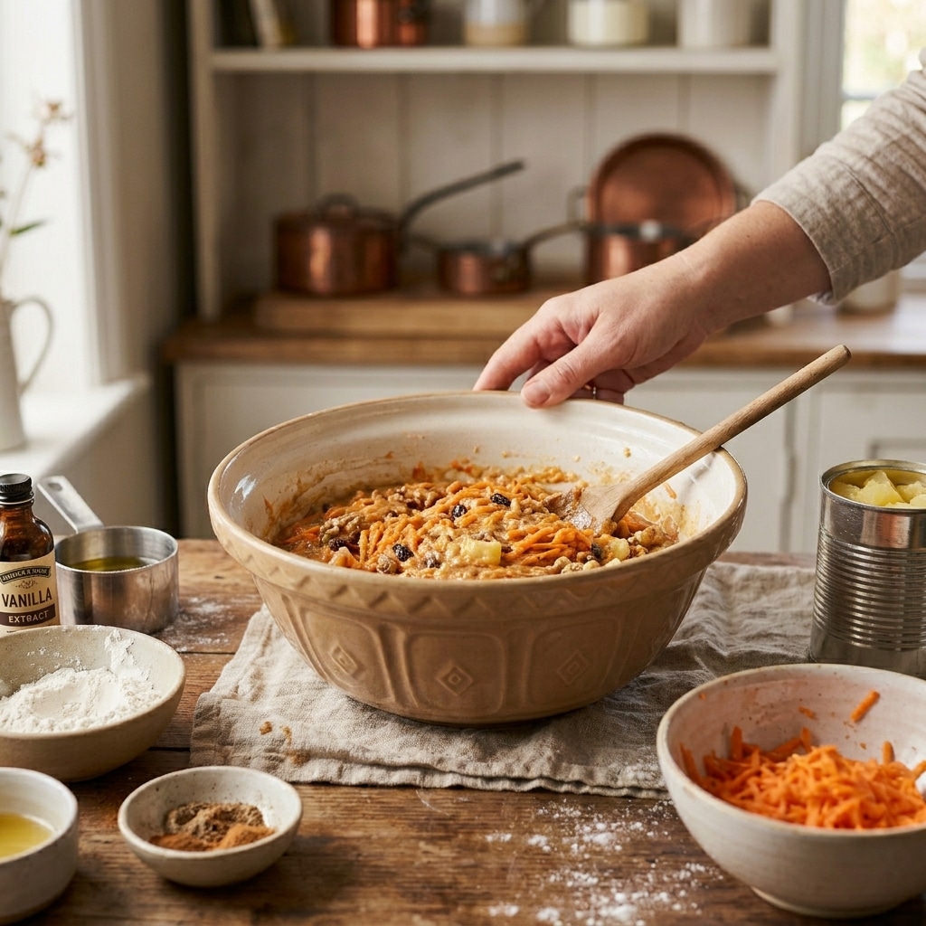 This is usually the moment where everything starts coming together, and honestly, it’s my favorite part. There’s something about watching a Hawaiian carrot pineapple cake recipe shift from separate ingredients into an actual batter that feels… satisfying.