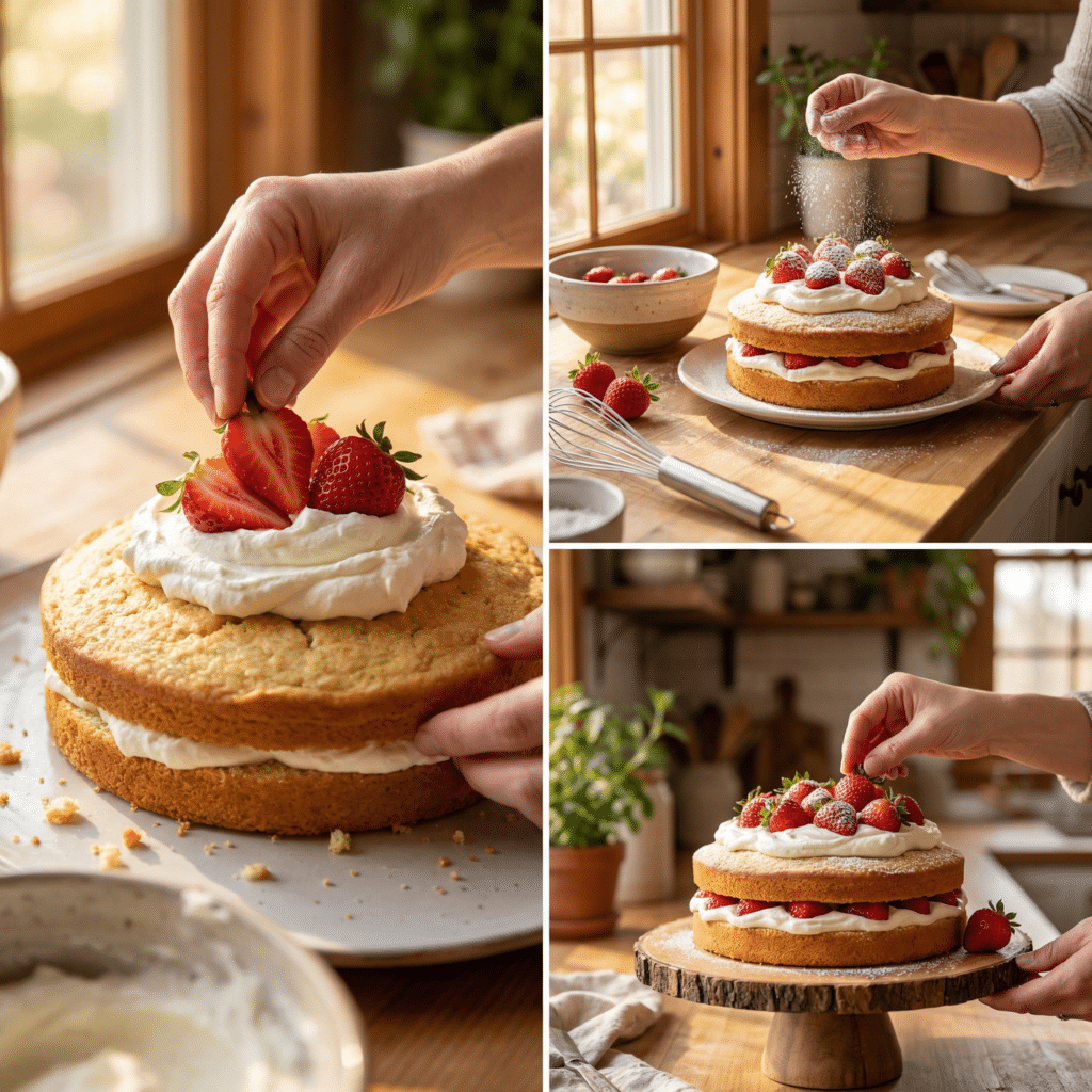 For decoration, you can add whole strawberries on top or let the layers remain slightly visible for a simple “naked cake” style. Once assembled, your strawberry shortcake cake recipe is ready to serve.