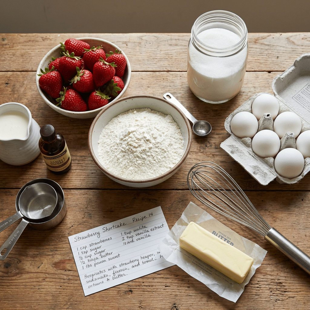 A great strawberry shortcake cake recipe starts with simple, high-quality ingredients. The beauty of this dessert is that it doesn’t rely on complicated techniques or unusual components. Instead, it focuses on combining soft vanilla cake, fresh strawberries, and light whipped cream to create a balanced and refreshing dessert.
